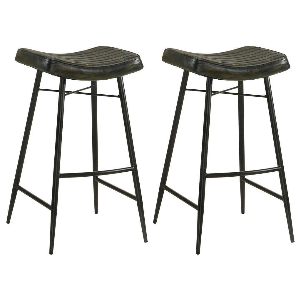 Inject a heavy dose of casual character to your kitchen or bar with the rich antiqued leather upholstery featured on a classic backless stool. Its gently curved seat cradles you in comfort, with channel tufting that adds texture and compelling style. A durable metal base delivers stability for all your seating needs, from a quick cup of coffee in the morning to a leisurely dinner catching up with your favorite person. Flared legs define its silhouette, with an X-cross brace just under the seat adding visual interest and depth. Gently curved footrests and built into the base, perfect for support and style for the whole family. Key Features: • Add a touch of classic style to your kitchen or bar with a backless stool featuring rich antiqued leather upholstery and channel tufting • Durable metal base provides stability for all your seating needs • Flared legs and X-cross brace under the seat add visual interest and depth • Gently curved seat cradles you in comfort • Built-in footrests provide support and style for the whole family