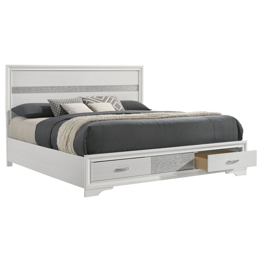 This alluring bed from the Miranda collection has both fashion and function. It features crisp lines and a headboard that's as simple as it is impressive. The footboard is built with two roomy drawers to hold extra sheets and blankets. The bed has an effortless timelessness and elegance. Add to the bedroom for a charming ambiance that's sure to please. Key Features: • Storage panel bed with integrated drawers in footboard design • Fully slatted platform eliminates need for separate foundation • Crystal-accent drawer pulls enhance the glamorous styling • Glitter trim accent at headboard and footboard adds visual interest • Bracket-style feet and beveled framing for a classic profile • Crafted with engineered wood in a bright white laminate finish