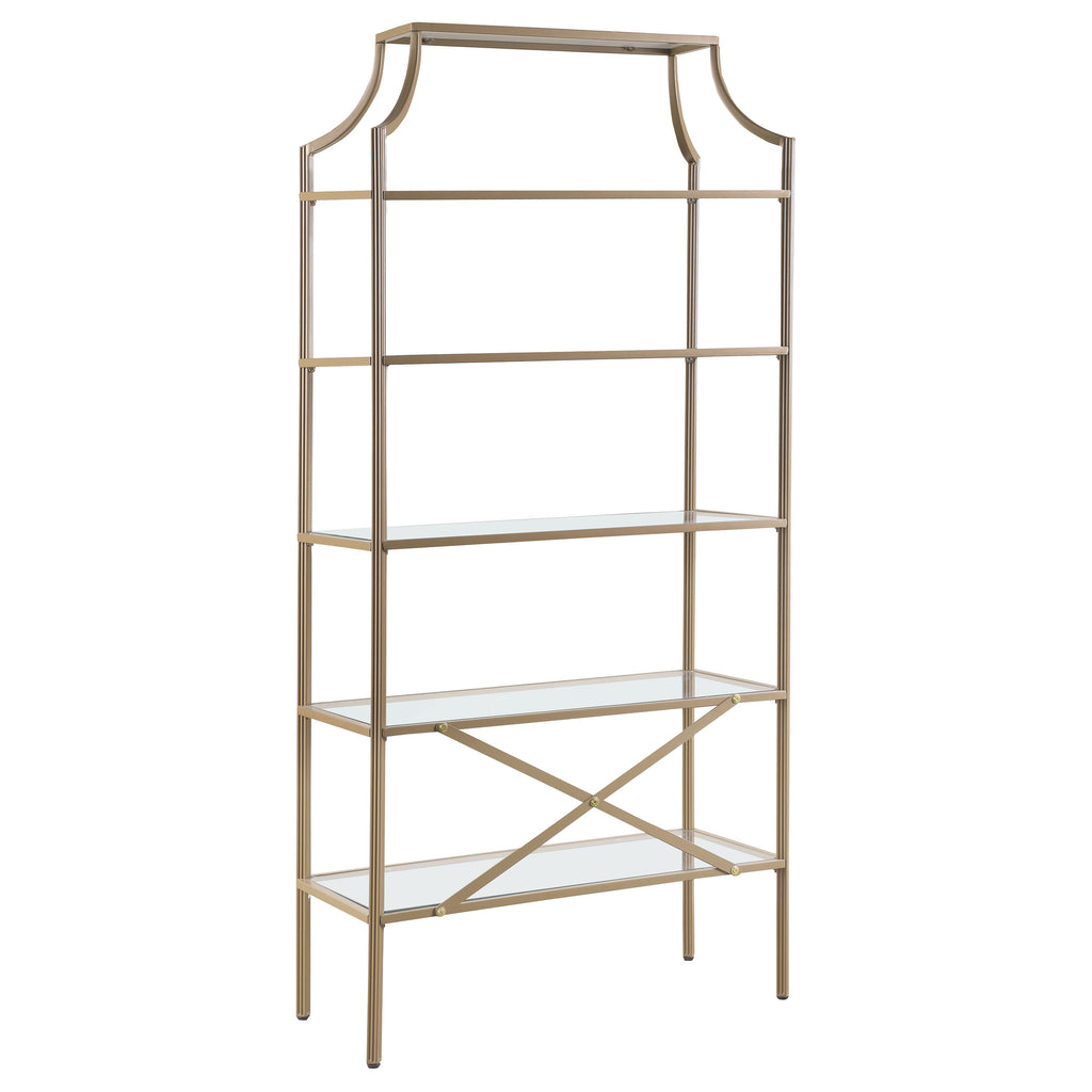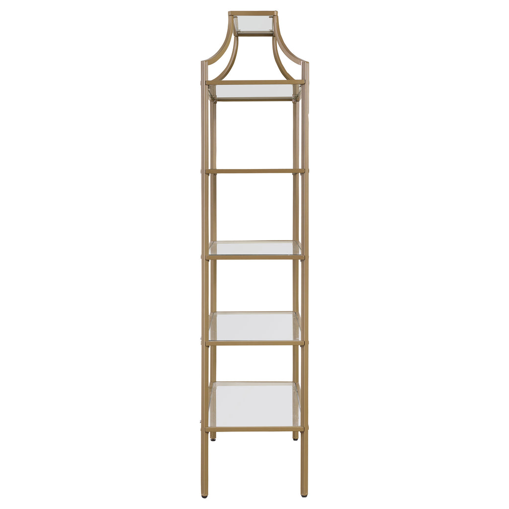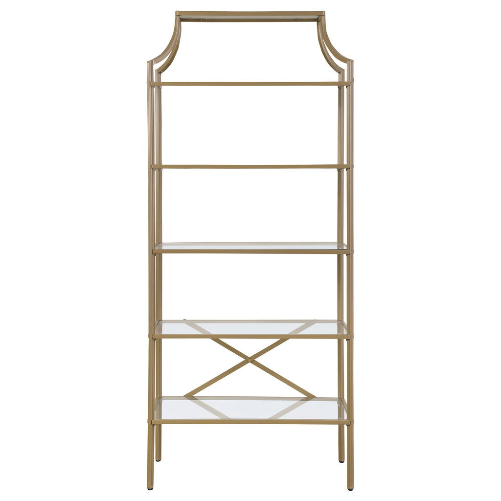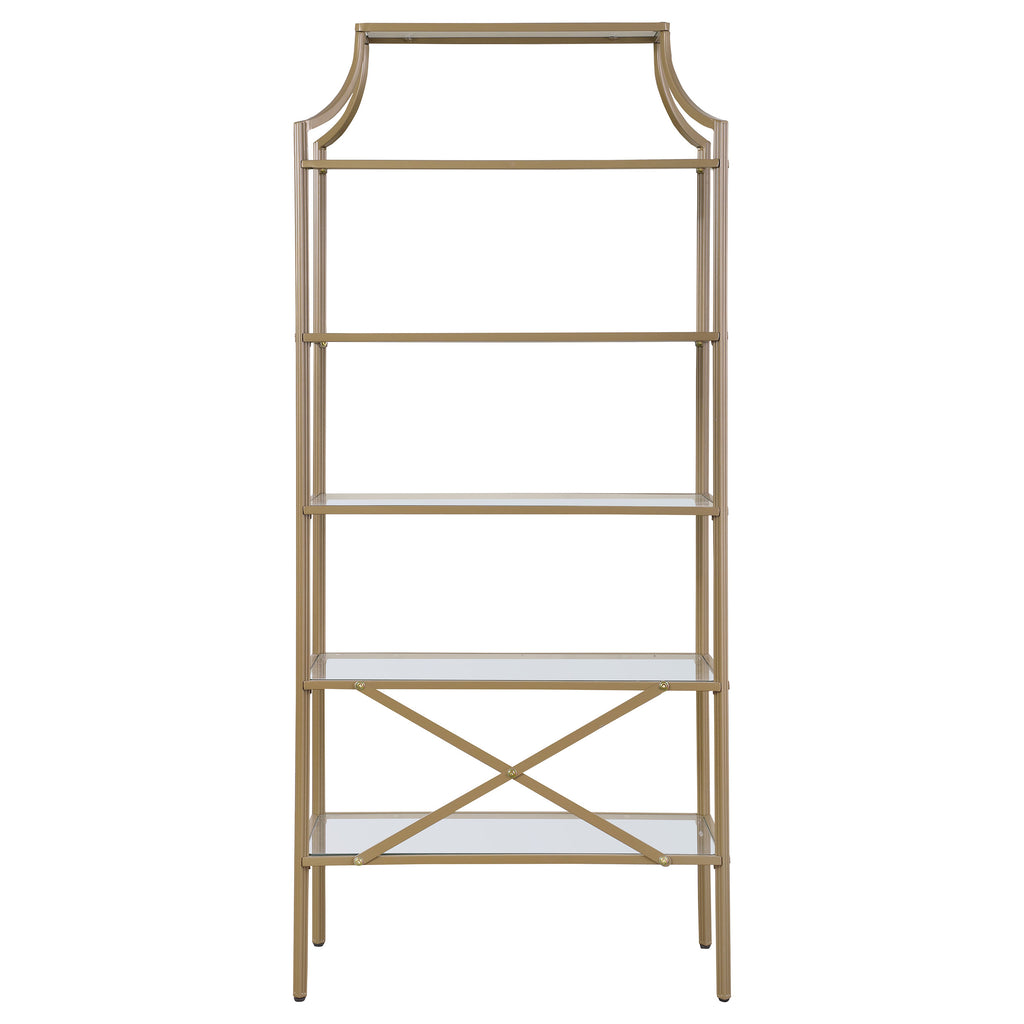 A call for strength and style gets answered by this bookcase. Contemporary style allows for easy placement within your space. The stylish metal frame in gold creates conversation. Enjoy durability as all glass elements are tempered. Updated unit boasts five (5) open shelves for use as storage or display. Key Features: • Five-tier bookshelf with glass shelves and matte gold metal frame • Open art deco silhouette features soft curves and geometric lines • Tempered glass shelving provides stable display for books and décor • Powder coated metal frame enhances durability and visual appeal • Slim profile is ideal for narrow living rooms, offices, or entryways • Tip-over restraint included for safe, anchored installation