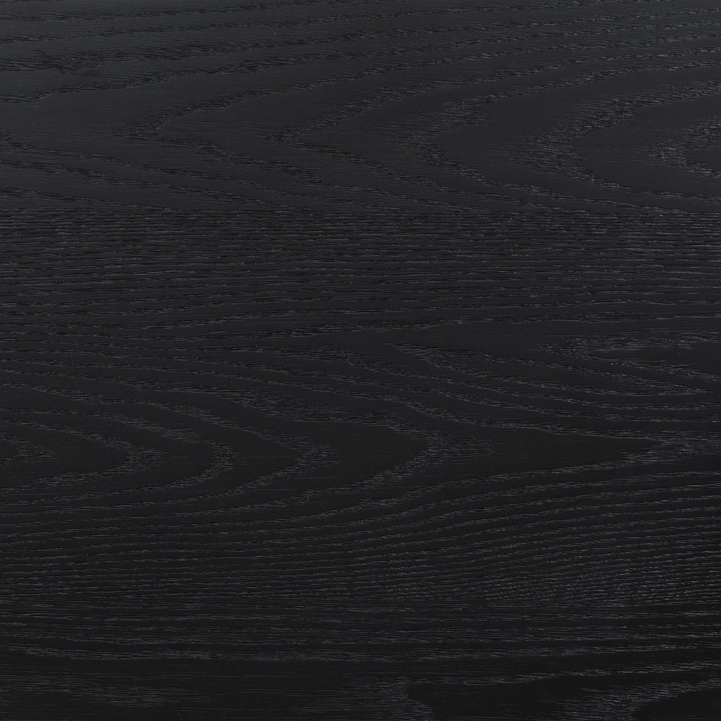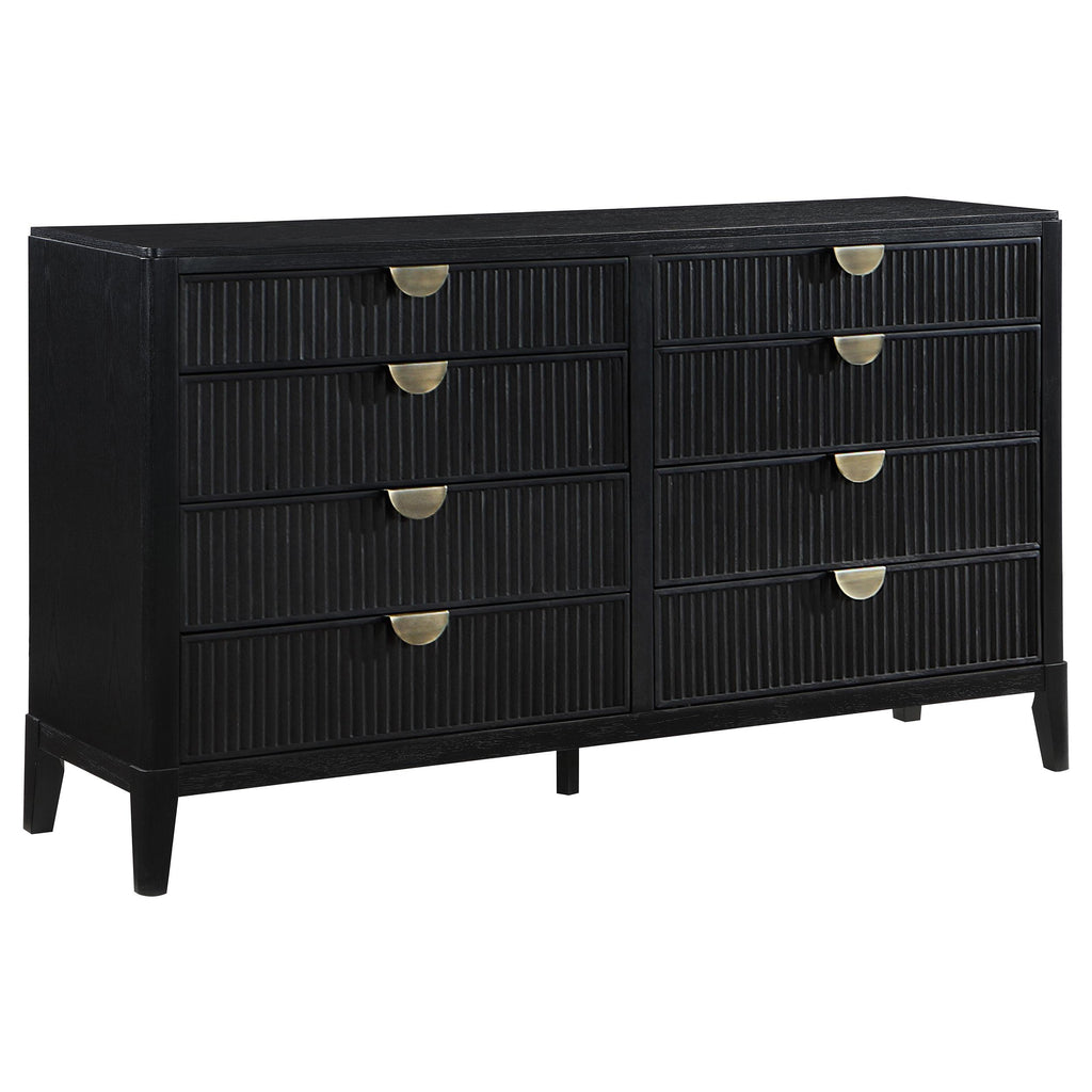 A rich black finish create a sophisticated palette for a four-piece modern bedroom set. Complete with wire brushing that creates texture, the set features fluted details that add elegance and character. The bed features an open silhouette with a low footboard, while a tall headboard centers your space. A two-drawer nightstand includes a felt lined top drawer to protect delicates like your watch or phone, leaving plenty of space in the bottom drawer for books and other essentials. The dresser and mirror set completes the look, offering plenty of storage in eight drawers, including felt lining in the top two, for clothing and accessories. Key Features: • Stylish and modern, a contemporary wood bedroom set features a wire brushed black finish • Square headboard and footboard create a complementary pairing and open silhouette • Fluted texturing highlights the bed, nightstand, dresser and mirror • Drawers feature demi-lune metal handles in a warm golden tone for sophisticated contrast • Bed includes slats with support legs to provide an excellent base for your mattress set • Drawers feature English dovetail joinery for excellent craftsmanship