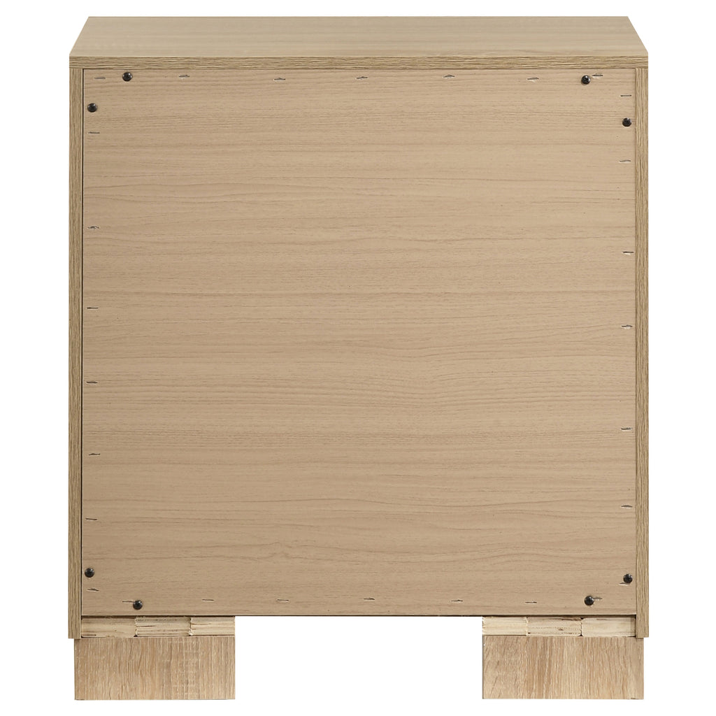 This two-drawer nightstand combines thoughtful utility with clean-lined modern design. Its boxy frame is finished in a soft light oak tone, accented by antique nickel hardware. Crafted from engineered wood with a scratch-resistant laminate veneer, it ensures daily durability. English dovetail drawers glide smoothly on 35mm metal extension glides, while hidden casters offer easy repositioning without compromising the nightstand’s clean base profile. Key Features: • Two-drawer nightstand in light oak finish with a compact and squared modern profile • Antique nickel drawer pulls offer sleek contrast to the warm neutral wood tone • English dovetail drawer boxes provide added structural integrity and durability • Drawers glide on 35mm full-extension metal glides for smooth daily functionality • Engineered wood frame with a durable and scratch-resistant laminate veneer finish • Hidden casters at the base allow for easy repositioning without visual distraction