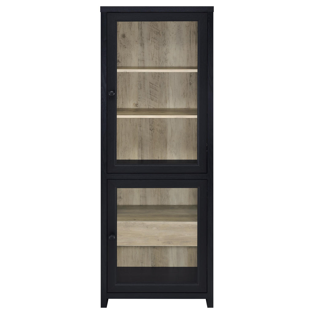 This three-piece entertainment center brings bold character and quiet refinement to the modern living room. Framed in matte black with framed glass doors and a natural wood-look interior, it offers a striking contrast that feels both grounded and elegant. Adjustable shelving provides room to display, while hidden drawers and cabinets keep everyday items tucked neatly away. With its tall, architectural profile and warm two-tone finish, this ensemble transforms your media setup into a curated focal point. Key Features: • Entertainment center with black frame and light wood-look interior creates bold visual contrast • Four glass-front cabinet doors on the TV stand conceal spacious open shelving for electronics • Tall cabinets include adjustable upper shelves ideal for display or media storage • Lower compartments with framed doors offer enclosed storage for games, consoles, or décor • Constructed from engineered wood, tempered glass, and durable laminate veneer surfaces • Easily supports TVs up to eighty-five inches while adding vertical storage with a clean finish