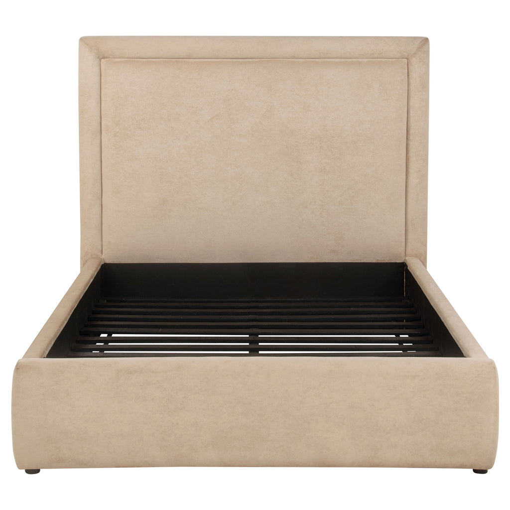Clean lines and understated elegance define this platform bed, wrapped in smooth upholstery from base to headboard. The simple panel design offers a tailored profile, softened by subtle padding and low foot rails for an inviting finish. With a fully slatted foundation, this bed supports a mattress directly, no box spring needed. Perfect for modern minimalists or transitional spaces, it balances comfort and clarity in a sleek, grounded silhouette. Key Features: • Queen bed with clean panel headboard and fully upholstered low-profile frame • Light saddle fabric adds warm tone and soft texture with a neutral foundation • Padded headboard delivers comfort and structure in an understated silhouette • Platform base with slats eliminates need for a box spring or foundation • Crafted with engineered wood, and supportive foam fill • Perfect for transitional or modern bedrooms with a minimalist focus