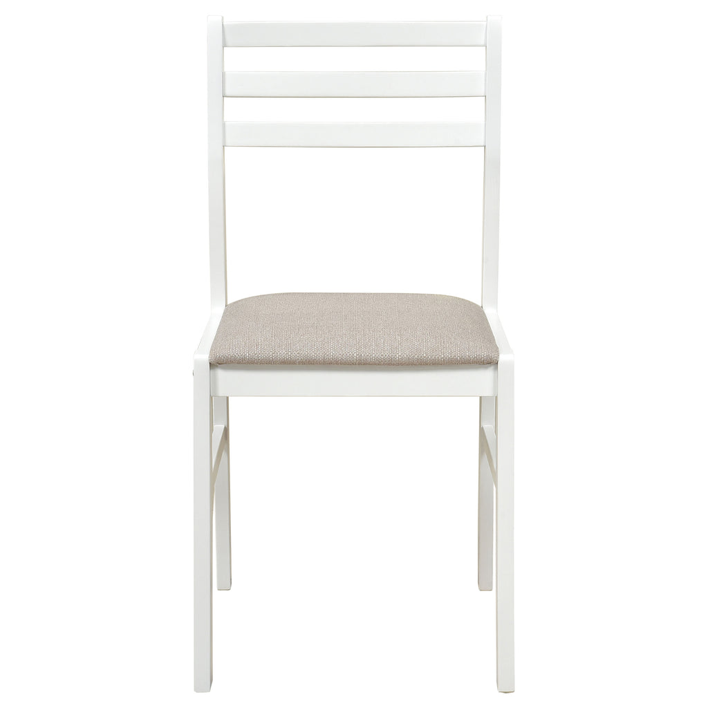 This lovely dining set lends an elegant touch of simple sophistication to a kitchen or breakfast nook. It comes complete with a lovely, round dining table and two comfy chairs upholstered in soft, light brown, padded fabric. The table is enhanced by a versatile drop-down extension which can be raised to accommodate an elaborate dining setup. Lowering it allows you to cozy up closely with a special someone over a leisurely breakfast or romantic, candlelit meal. A smooth, polished, natural wood finish gracefully complements the sleek, stylish silhouette of this beautiful three-piece set. Key Features: • Light and airy natural finish dining set is perfect for a casual breakfast nook • Round table with drop down leaves saves space • Chairs feature a contemporary rendition of a ladder back style • Padded seats in tan microfiber • Sold as a three piece all-inclusive set: Table plus two chairs