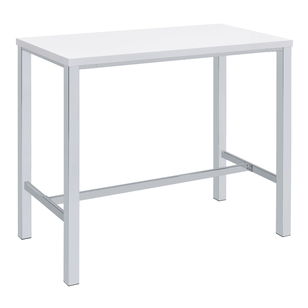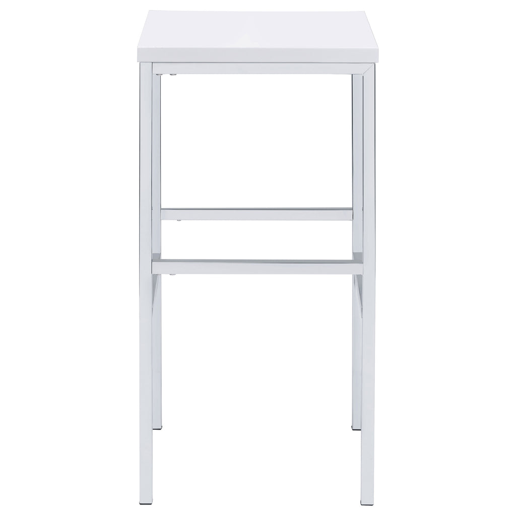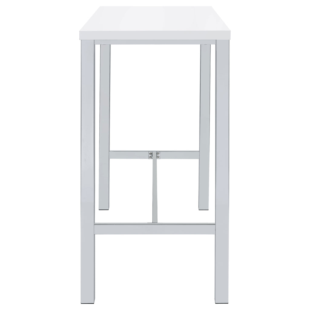 Ultra-modern with a clean lined silhouette, this five-piece bar set comes complete with a rectangular shaped bar table and four bar stools. Perfect for more contemporary home, the table comes with sleek and square legs made and a steel frame in an electroplated and polished chrome finish that lends a luxurious gleam to any room. The tabletop features a high gloss white lacquer finish and seats four people comfortable. Each stool also features a matching lustrous high gloss white seat and matching legs. One the stools are also footrests for extra support and stability. Key Features: • Contemporary five-piece pub height bar set • Set includes bar table and four (4) backless bar stools • Steel frame electroplated and polished in chrome • High gloss white lacquer finished tabletop and seats • Constructed with steel and MDF