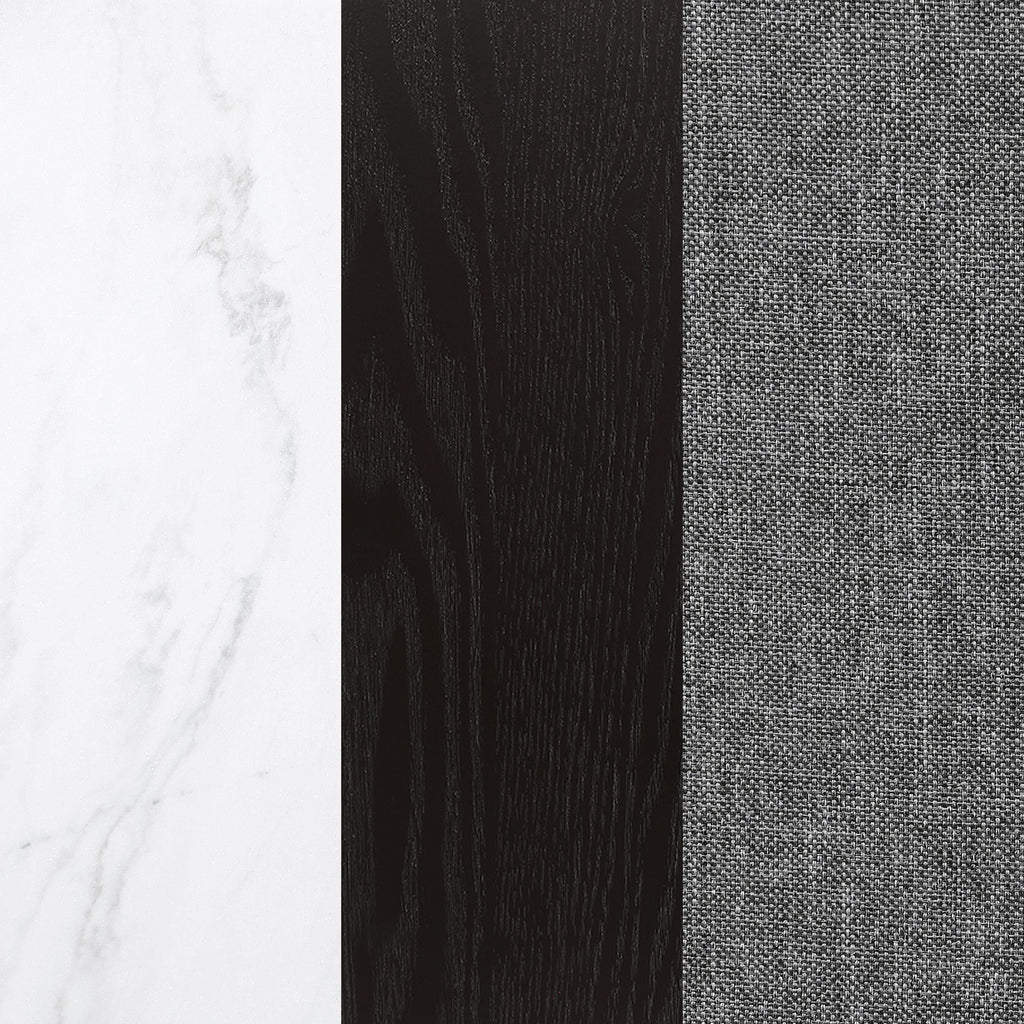 Bring together family and friends at this modern rustic style dining table set. The table features a rectangular, thick, white marble top that is spacious enough for six people. Sleek open and airy trestle base with a center punch out, rustic espresso striking color combination lends a dramatic touch and grounds the room elegantly. The set of chairs with a rolled backrest with button-tufted details lends a traditional aesthetic to a space. Also, bringing to your home the classic elements is a padded seat with individual nailhead trim that offers a charming detail. Key Features: • Refusing to choose between style and function, this rectangular table offers a place to share a meal with your family • The table is supported by an oak veneer panel base with a marble table top • An open trestle base lends a modern industrial flair • Plushily padded side chairs are adorned with rolled backs and button-tufted upholstery with bold nailhead trim