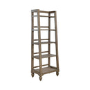 Liberty Furniture Americana Farmhouse Leaning Pier Bookcase in Dusty Taupe 615-HO201. Be distinctively different with the Americana Farmhouse leaning pier bookcase. Crafted with excellence using poplar solids and white oak veneers, this piece features a Wire-Brushed Dusty Taupe finish. There are five graduated shelves implementing the leaning design anchored by turned bun feet. Show off your craftsman's flair with the Americana Farmhouse leaning pier bookcase.
