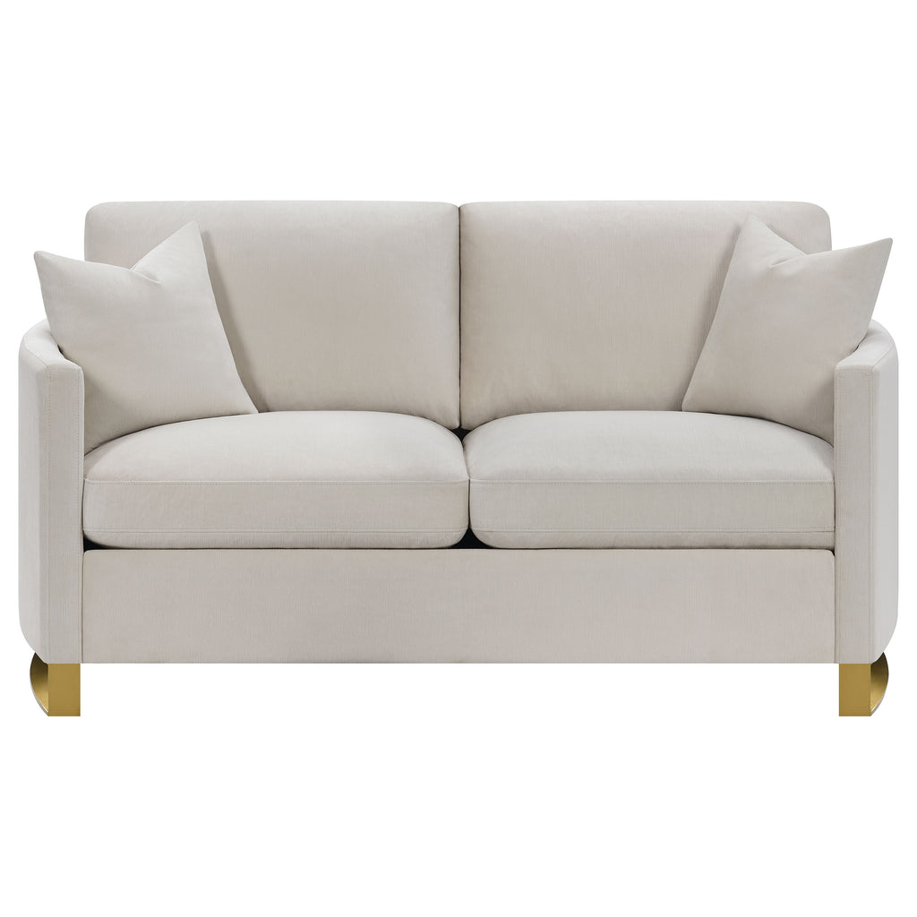 Indulge in opulent comfort with this textured velvet living room sofa collection. Reversible feather blend seat and back cushions, curved arms, and gold stainless steel legs. Smooth upholstery and lustrous details blend simplicity with timeless splendor, creating a refined focal point that enhances both modern and classic interiors with style and relaxation. Key Features: • Versatile two-piece sofa set suits various room sizes and layouts • Textured velvet finish in a warm camel tone enriches visual depth • Reversible feather blend cushions provide adaptable comfort and support • Curved arms and gold-accented stainless steel legs add subtle luxury • Fully encased engineered wood frame with sinuous springs and pocket coils for lasting stability • Reversible seat and reversible back cushions simplify upkeep and personalization
