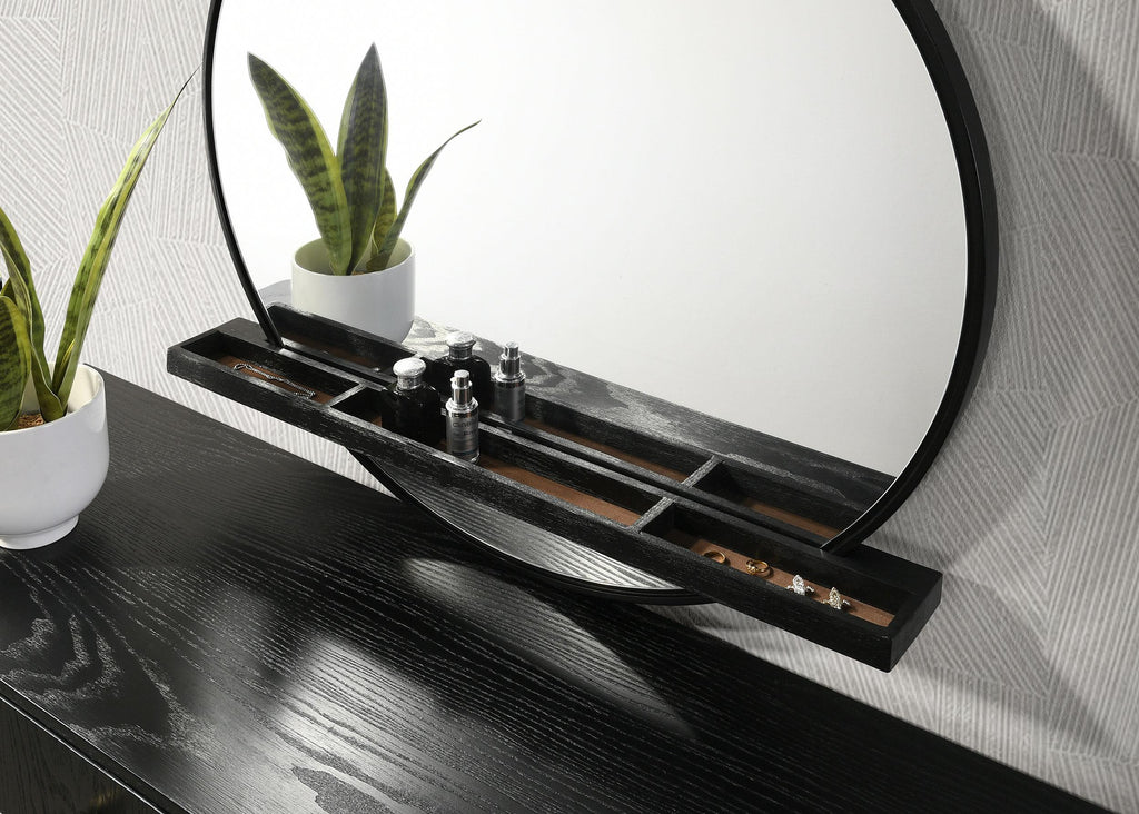 Woven rattan head and footboards create a bold focal point within this four-piece modern bedroom set that includes a nightstand, dresser, and mirror. Its rich black frame finish enhances each piece, offering a distinctive sense of structure that's perfectly augmented with soft, muted gold accents. The nightstand offers three drawers, with felt lining in the top, for bedside necessities and personal items. An eight-drawer dresser also includes felt lining in the top drawers and provides ample space for clothing, linens, and beyond. Drawers are decorated with pairs of ball knobs while rounded corners and decorative legs add dimension and depth to the bed, nightstand, and dresser, and the mirror includes a jewelry tray perfect for delicates, fragrances, and even decor.