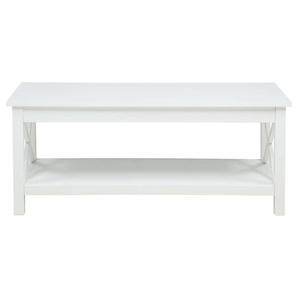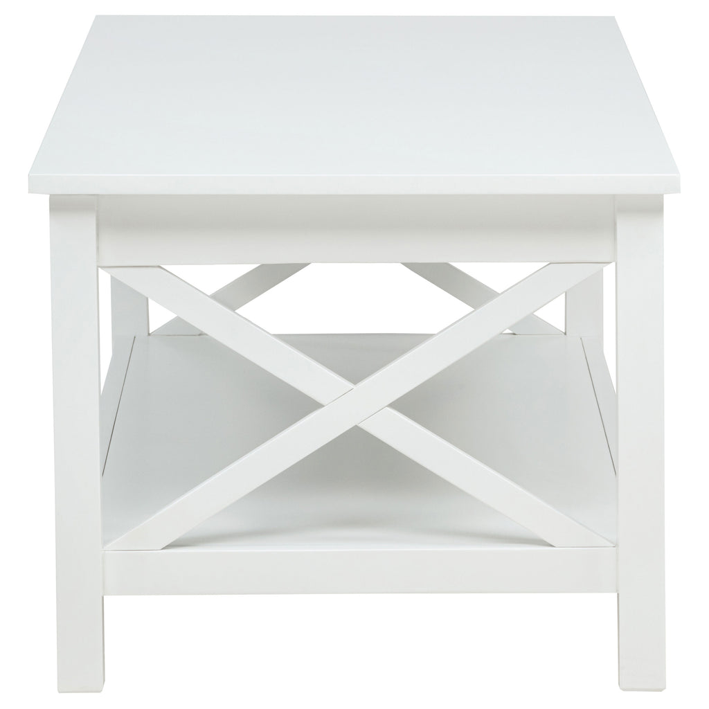 Blending clean lines with classic charm, this occasional table set offers timeless appeal with practical purpose. The lift-top coffee table features hidden storage and a rising surface for flexible use, while the matching end table provides open shelving and farmhouse-inspired X-frame sides. Finished in bright white and crafted from pine and engineered wood, this living room set brings fresh energy and functional design to everyday moments. Key Features: • Occasional table set with lift-top coffee table and matching X-frame side table • White finish provides a clean, versatile look for farmhouse or coastal themes • Lift-top coffee table reveals hidden storage for remotes, books, or blankets • End table includes an open shelf and square top for added display space • Crafted from solid pine and engineered wood for everyday durability • Perfect for casual living spaces seeking charm, utility, and coordinated design