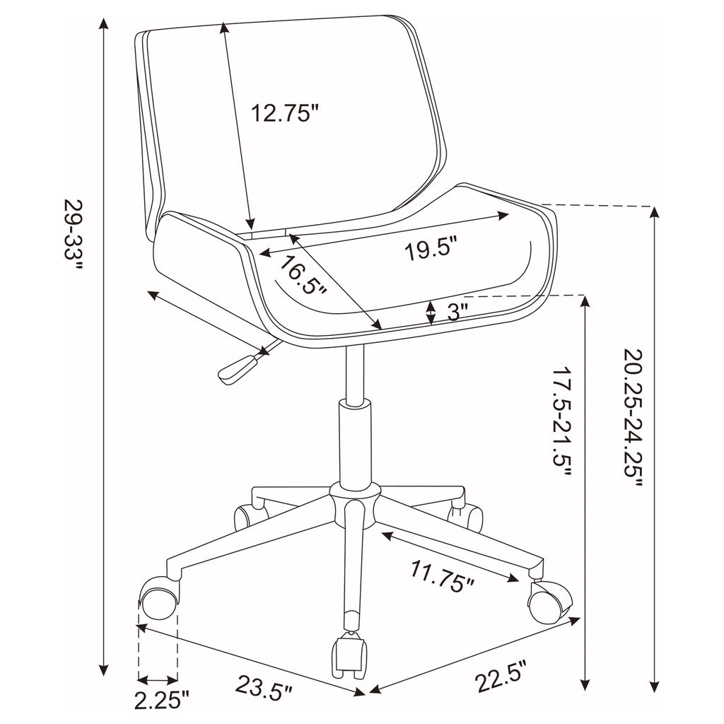 Stay true to a classic retro look. Delivering exceptional comfort, this office chair is a perfect blend of mid-century and modern styling. Tasteful elegance follows a clean, low-profile silhouette with a curved, padded seat and a gently curved seat back. Enjoy a lush palette with ecru leatherette upholstery and walnut and chrome trim. Adjustable seat positions and caster wheels add to its utility with custom seating and portability. Key Features: • Enjoy a classic retro look with a clean, low-profile silhouette, curved, padded seat, and gently curved seat back in ecru leatherette upholstery and walnut and chrome trim • Delivering exceptional comfort, adjustable seat positions and caster wheels provide custom seating and portability • Tasteful elegance follows a perfect blend of mid-century and modern styling • Enjoy a lush palette with ecru leatherette upholstery and walnut and chrome trim • Adjustable seat positions and caster wheels add to its utility with custom seating and portability