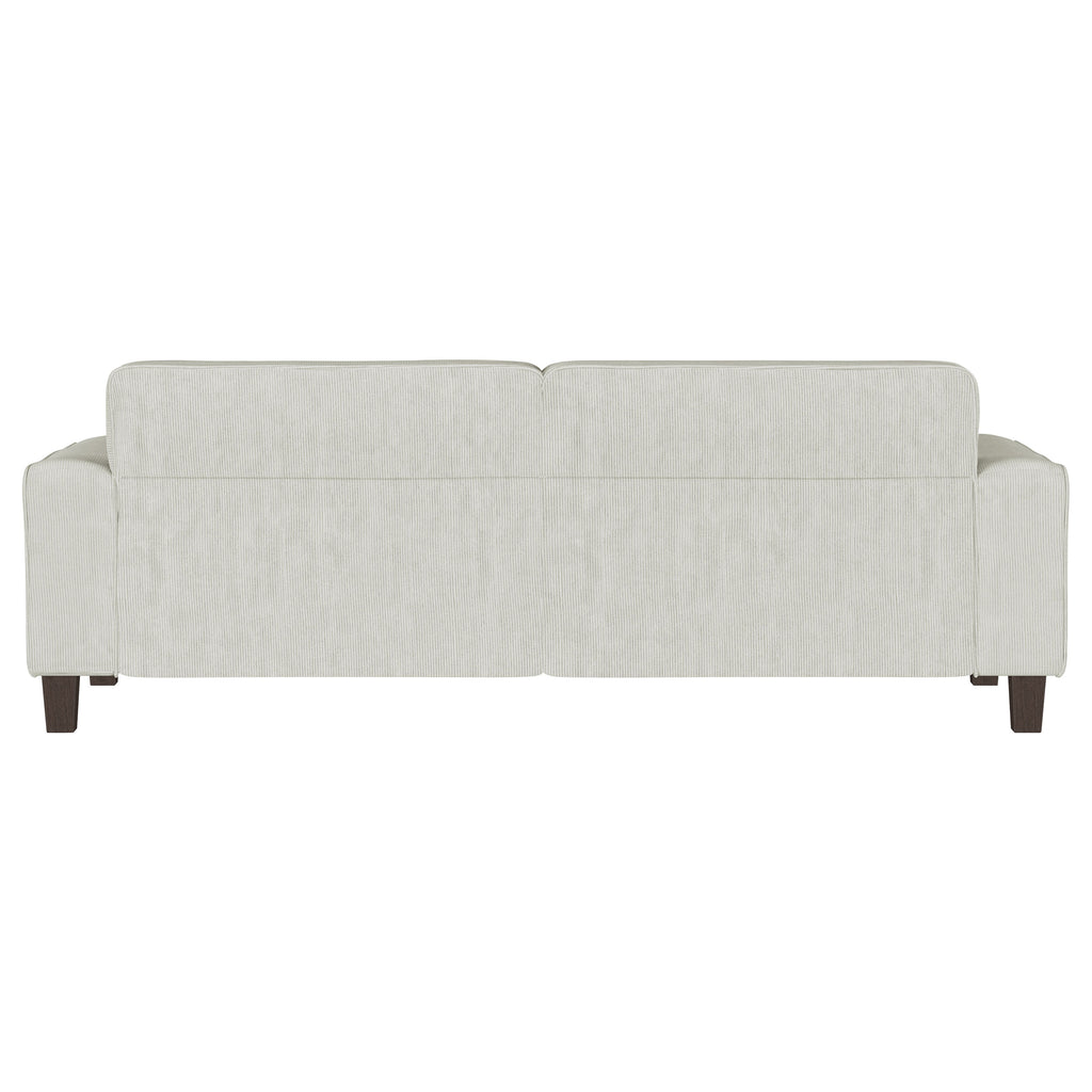 Create a stylish and infinitely comfortable and inviting living space with a modern sofa. Its timeless stance features wide track arms that pair perfectly with plush cushions for an indulgent seating experience. Great for game days, entertaining, or evenings at home, the sofa features plush upholstery with corduroy inspired texture that adds depth and dimension. Back cushions are plush and tufted, offering a grid pattern that's clean and refined. Tapering feet complete the look, offering height that creates an airy finishing touch perfect for modern living. Key Features: • A modern sofa offers inviting flair with soft upholstery in a lovely neutral hue • Textured corduroy-style upholstery is extra plush for a cozy and inviting touch • Biscuit tufted back cushions create a stylish touch of texture and dimensionality • Wide track arms define a clean-lined silhouette that offers versatile style in any living space • Tall, tapering wood legs create light, airy lift, perfect for a modern living space • Seats feature sinuous springs and coils for optimal comfort and support