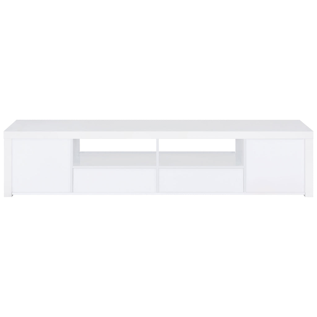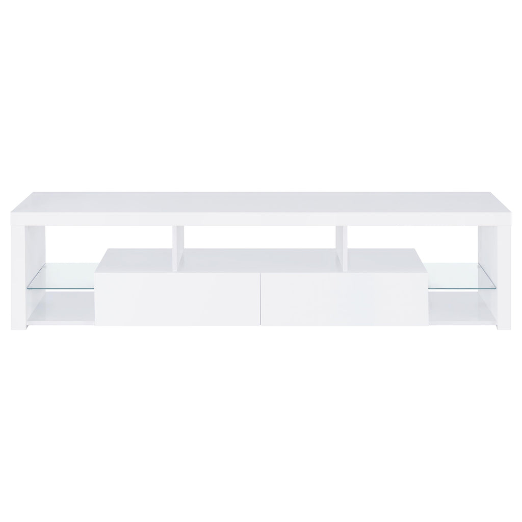 Elevate your entertainment realm with our sleek, modern TV stand. With a pristine glossy white finish and clear glass accents, it exudes elegance. Beyond looks, it's the epitome of functionality. Soft-close drawers glide effortlessly, housing your gadgets, while the glass shelves offer a stylish display. Spacious storage compartments keep your media essentials neatly organized. This stand, a harmonious blend of style and function, becomes an indispensable centerpiece for any contemporary entertainment space. Key Features: • Sleek, modern TV stand with pristine glossy white finish and clear glass accents • Soft-close drawers glide effortlessly, housing your gadgets • Glass shelves offer stylish display • Spacious storage compartments keep media essentials neatly organized • Harmonious blend of style and function for any contemporary entertainment space